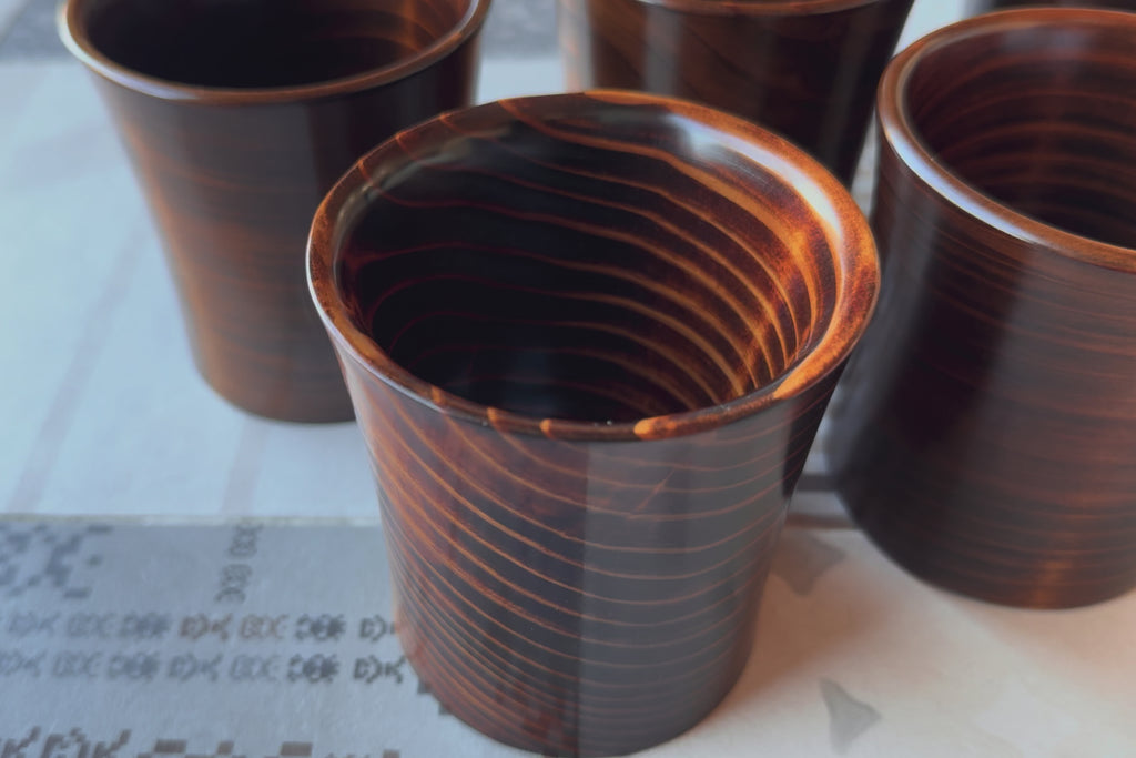 漆を塗ると夏の柔らかい層は、ぐんぐん漆を吸い込み濃いブラウンに。冬の堅い層と樹脂や節など堅牢な部分は、漆が入りづらいため、薄づきとなり、ゴールドに輝き出します。