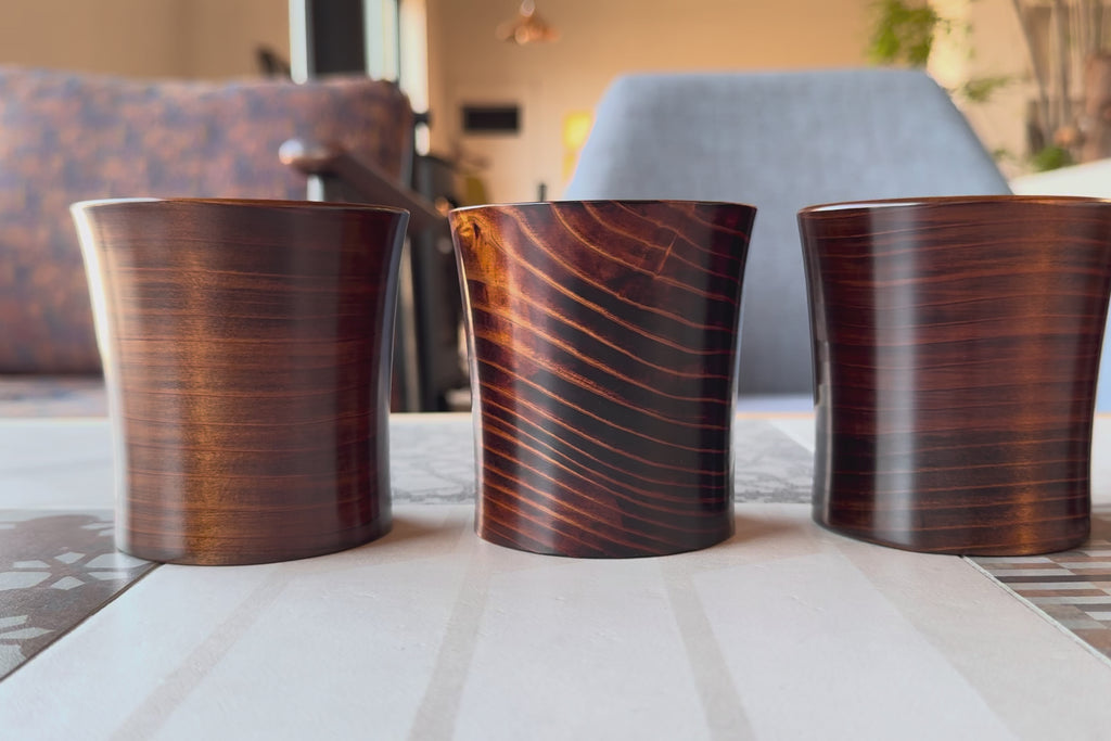 手に吸いつくような触り心地とゴールドに輝く年輪。光を浴びて艶めく佇まいは、息を飲むほど。