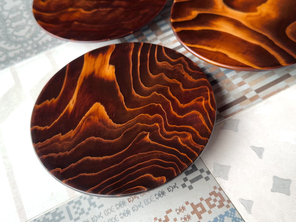 お皿とボウルは、より自然の造形美を感じる部位を使用。杢(もく)と呼ばれるキラキラと光る模様にも時折、出会えます。